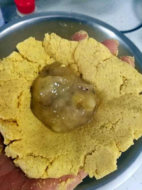 8这时面团比较湿润了,再轻轻按压一个坑,填一勺香蕉泥包住,上面的面包不住的话再拿一小块新面填上也可以,没那么多约束。