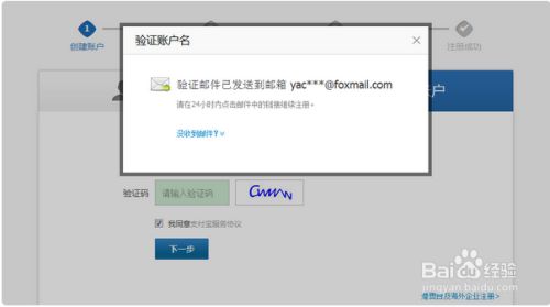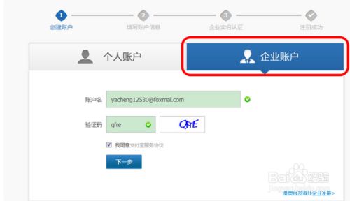 2、在“创建账号”页面,选择企业账号。然后输入邮箱名(邮箱名就是新注册的支付宝帐号名称)等信息,点击“下一步”。
