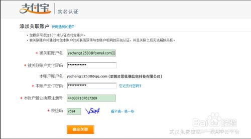 9、填写主帐号与子帐号信息,完成关联认证。一个企业支付宝主帐号最多可添加10个未认证的支付宝账户。被关联账户将通过与您本账户的关联而获得与本账户相同的实名认证,并且关联之后无法解除关联。