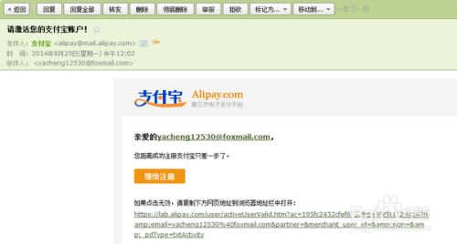 4、登陆邮箱打开相应的邮件,点击链接激活支付宝账户。