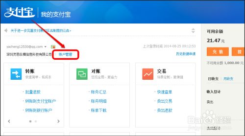 7、使用主帐号登陆支付宝后进入主界面,点击“账户管理”。