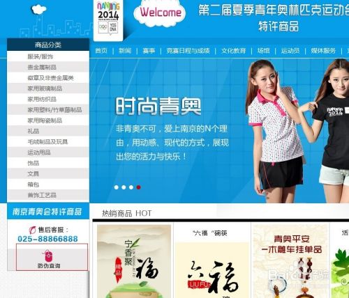 方法三:打开青奥会官方网站http://www.nanjing2014.org/cn/,在网站首页底部有一个特许商品栏目,点击打开,点击左面的防伪查询进入青奥会特许商品验证中心输入产品的查询编码。