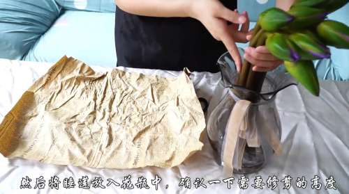 2然后将睡莲放入花瓶中确认一下需要修剪的高度。
