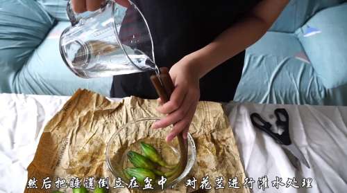 4把睡莲倒立在盆中对花茎进行灌水处理,直到花进口不再冒泡,这样可以使其充分的补充水分。