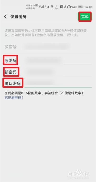 最后输入原密码,再填写二次新密码,点击右上角的【完成】即可。