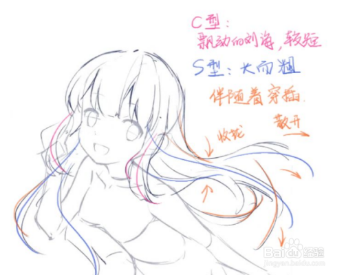 接着就可以画一些比较有动感的部分了,一般头发的运动也是呈“C型”和“S型”为主。C型 简单来说就是单个方向的弧形,通常是比较细的或者比较短的头发组,还有发丝会出现C型。(我们这里强调的是运动形成的形状,卷发那种每根头发本身就具备S型的情况跟这里讨论的不同)当然,如果你本身画的整个头发都是运动比较弱的情况有时候粗的头发组也会呈C型。