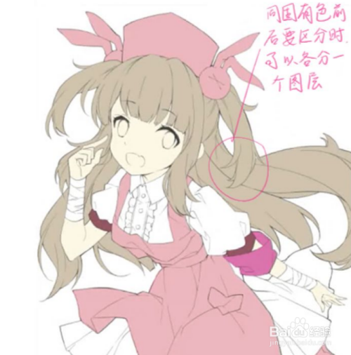 为了便于之后的刻画,像这里的辫子我们要跟后面的头发有所区分的时候,可以把辫子画在一个新的图层。其他的图层划分,你可以按颜色划分,也可以按不同的物体来划分。同时注意要把白色的区域也涂满,背景为白色时,可以先把白色区域用灰色填好再ctrl+u提高明度得到白色。