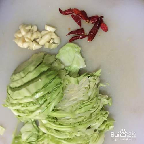 将卷心菜洗净,切成细丝状;将蒜头去膜、洗净,切碎;将干红辣椒洗净,切成碎块;