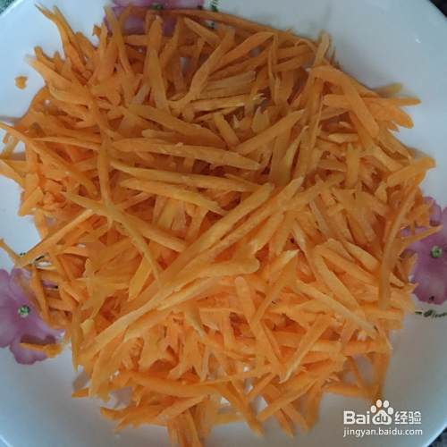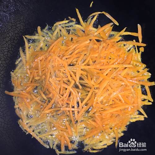 开火,锅里加适量的食用油,待油温升高,下胡萝卜翻炒至变色;