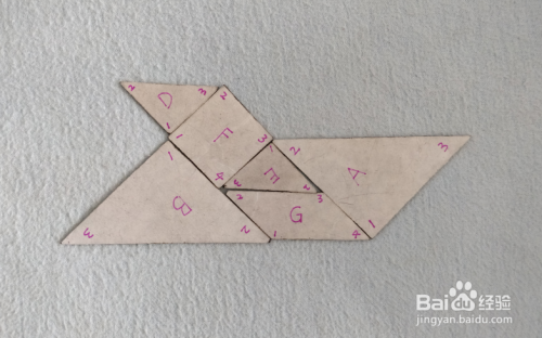 先把形状F放在桌面平台上1在左,3在右,2在上,如图。