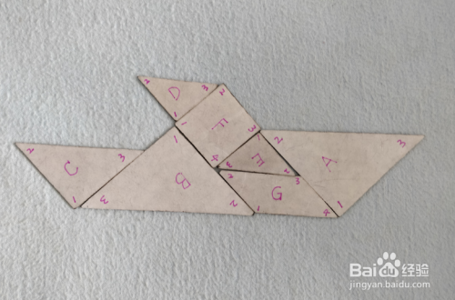 把C放在B的左侧挨着,2、3在上,1在下,C1挨着B3,如图。一艘游艇就完成了。