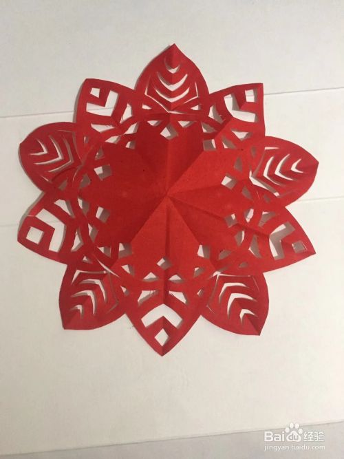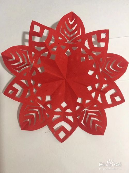第七步 剪完多余的彩纸之后 再剪里面的花瓣条纹 镂空部分和其它涂实的部分等等 都剪完之后 打开铺平 一副美观漂亮的十角窗花图案就裁剪完成了