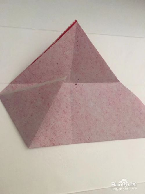 第一步 用一张16厘米长 16厘米宽的正方形红色彩纸 对角摆放 然后从下向上对角折叠