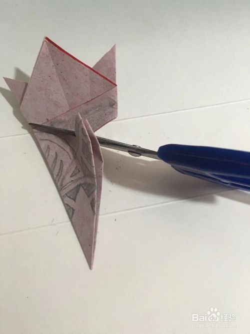 第五步 再把左边的三角折叠至背面 然后调整成为五等分 再拿起绘图铅笔 在上面一边画上半个花瓣角 下面画上一个尖角 和连接处