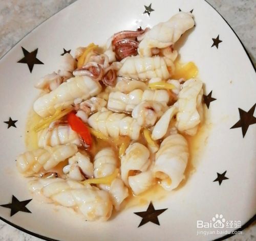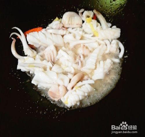 锅烧七成热,放适量花生油,先放生姜小火煸出香味,再把鱿鱼倒下去开大火爆炒卷成花,再铲出来备用。