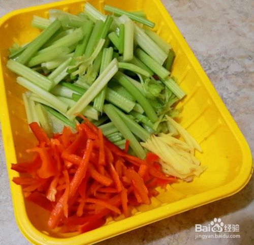 再把芹菜洗干净,去掉根部,切成段,把美人椒洗干净去籽切成丝,生姜去皮也切成丝备用。