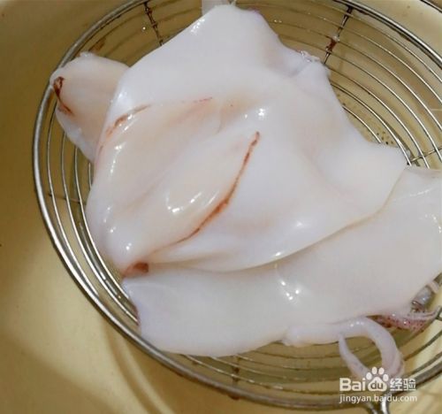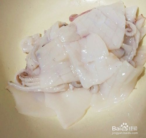 先把鱿鱼处理干净后,再切成片,打十字形花,控干水份备用。