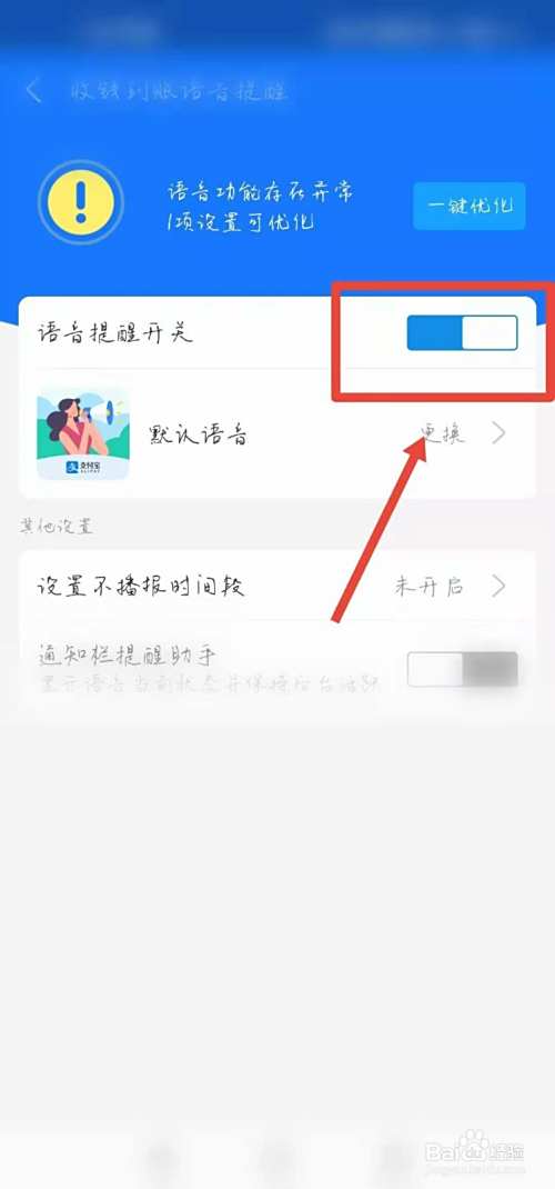 在收款到账语音提醒界面,将语音提醒开关打开,即可完成支付宝收款语音播报设块伟互置。