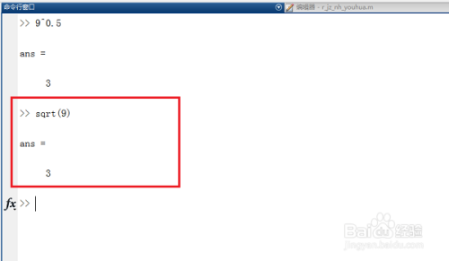 第二步通过sqrt函数表示根号,在命令行窗口中输入“sqrt(9)”,按回车键可以看到得到相同的结果,如下图所示: