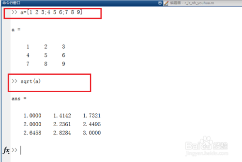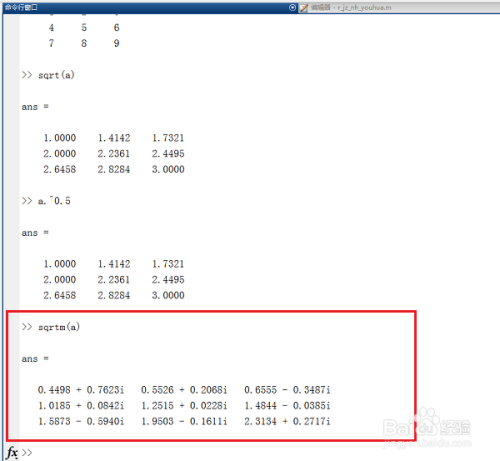 第一步如果是对矩阵求根,sqrt(a)是对a矩阵每行没列的数据求根,如下图所示: