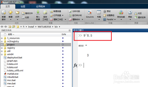 第一步在我们的电脑上打开matlab,在命令行窗口中输入“9^0.5”,按回车键可以看到9求根的结果,这是一种方式,如下图所示: