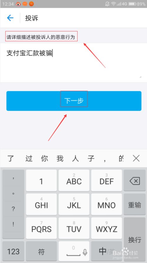 7、我们首先选择对方用什么方式欺诈骗钱,然后点击“下一步”,填写详细的被投诉人的恶意行为,再点“下一步”。