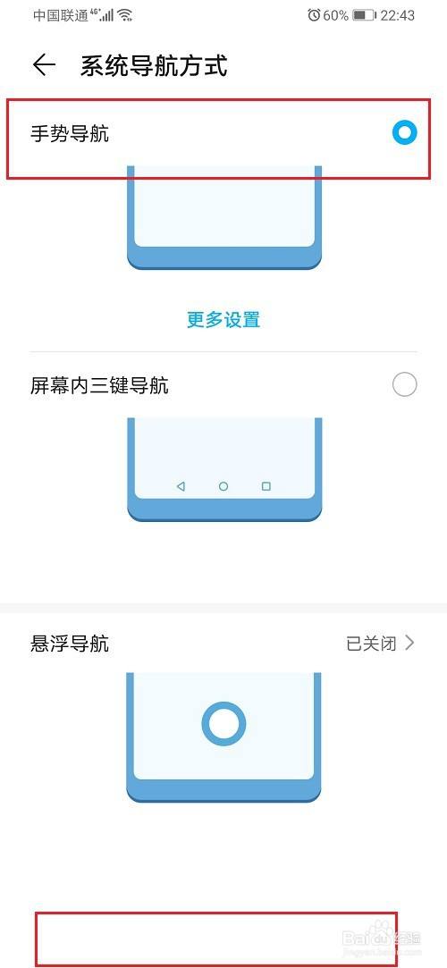 第四步在系统导航方式中,选择手势导航,华为手机下面三个键就隐藏了