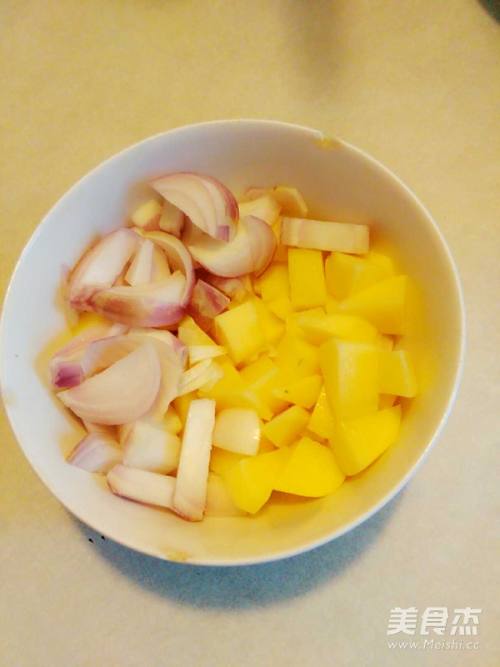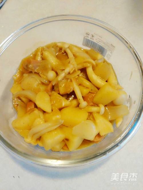 土豆洗净切小块,洋葱洗净切块,白玉菇去根掰开洗干净沥干水,火腿肠切小片