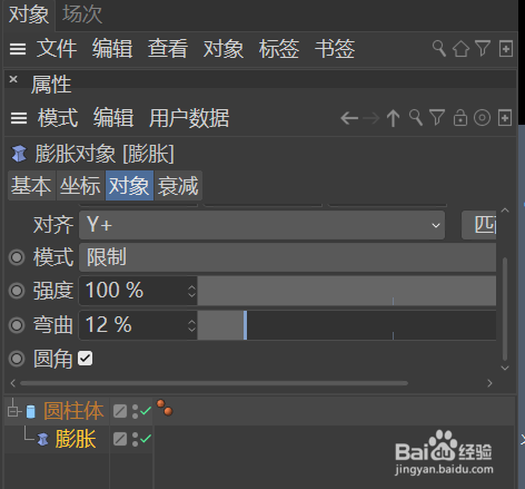 添加膨胀变形器并将其作为几何体的子对象,在属性面板中可以设置膨胀变形器的相关参数,如图所示。