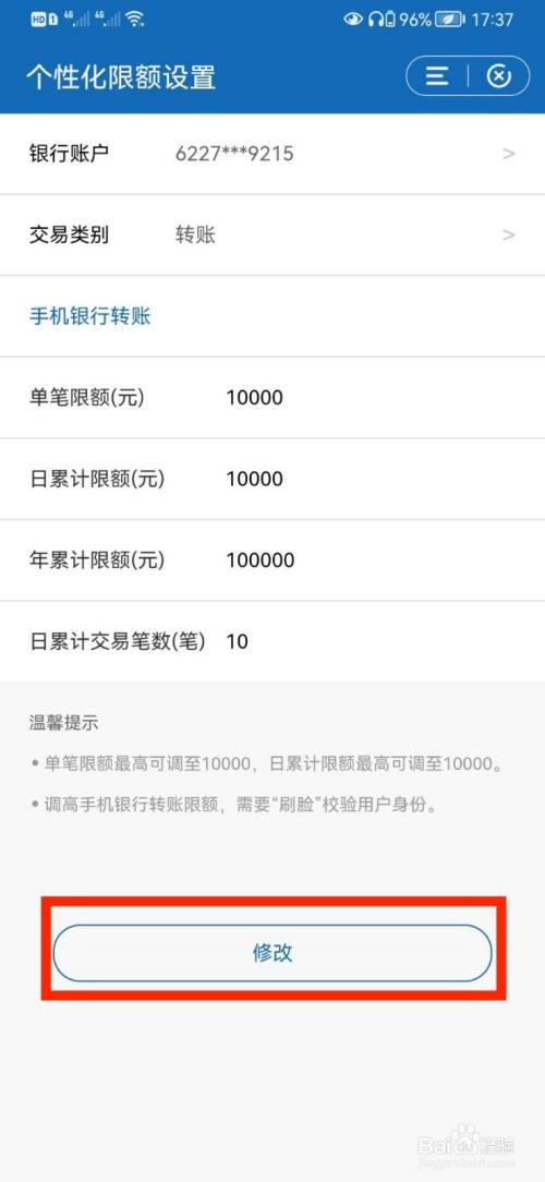 在个性化限额设置页面,选择转账类型后,设置转账限额,点击【修改】。