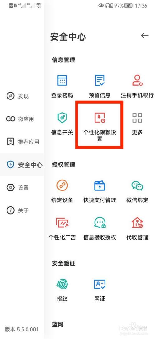 在更多菜单列表,打开【安全中心】/【个性化限额设置】。