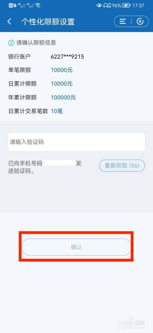 在个性化限额设置信息确认页面,确认信息无误后,输入短信验证码,点击【确认】即可。