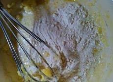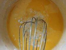 加入打散的鸡蛋液及糖粉,用打蛋器继续搅匀。