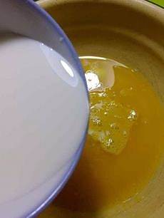 黄油隔水融化成液体后,加入牛奶用手工打蛋器搅匀。