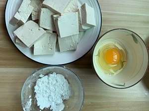 2. 准备食材:豆腐切块,鸡蛋一个,淀粉适量