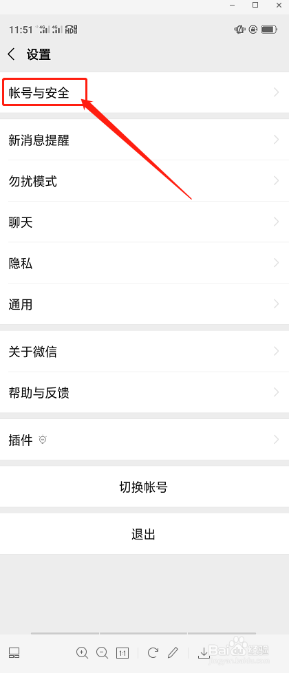 1:打开我们的微信“设置”,点击之后看到“账号与安全”,进入下一步。