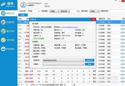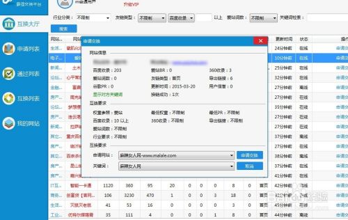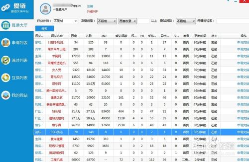 网站添加完后可以到互换大厅里面去选择相应的网站进行交换链接,最好选择与自己网站类型相关的网站进行交换,直接点击右边的申请交换就可以与对方进行交换链接,如果申请的时候显示没有符合条件的网站,那么就是对方站长设定了交换的条件比如收录量,权重,类目等。如果条件符合就可以直接申请,申请的时候可以选择我们自己的相应关键词。