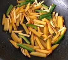 倒入土豆条,转中火,翻炒2分钟,中间加一勺水,使其更快断生。