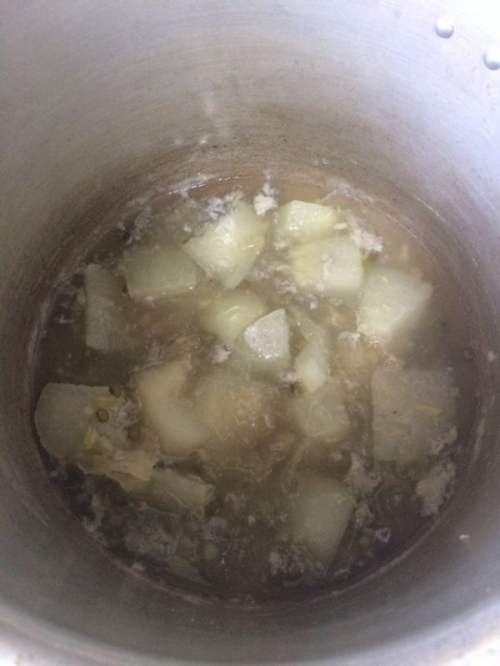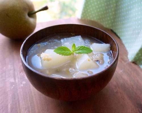 3将切块的雪梨倒入煮好的银耳绿豆汤中。