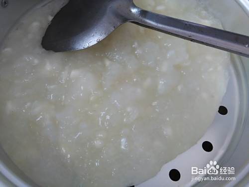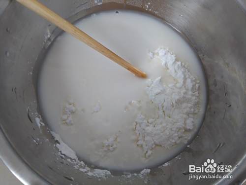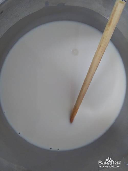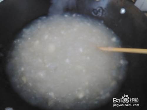 将剩下的800克水倒入锅中大火烧沸。改为小火,尽量的小,因为这样子淀粉不能糊。慢慢得把淀粉浆倒入祸里(向小茶壶口倒茶关不多),一边倒一连用筷子搅拌,防止有成块有疙瘩。我光顾拍照了,这里稍微有点小疙瘩。