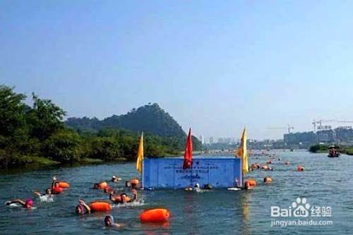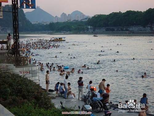 1、常常能看到一些专业游泳爱好者一群人横渡漓江的,如果你不是专业游泳能力强的,在岸边水流不急的地方玩玩水就可以了。