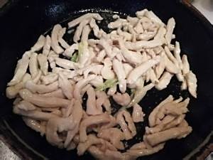 将配菜炒至七成熟,就是有点透亮的感觉,把鸡胸肉倒入锅中翻炒两下,再加入调好的料汁,翻炒至汤汁粘稠就可以出锅了