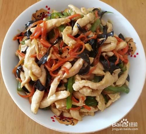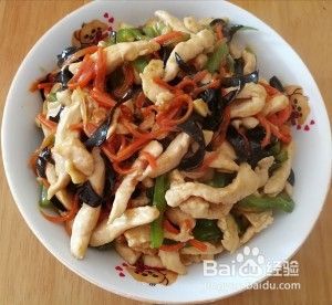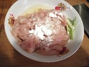 鸡胸肉洗掉表面的膜和油脂,洗去血水,顺纹切成丝,加半小勺盐,料酒,半个蛋清抓匀,感觉有点儿微微黏手就可以了
