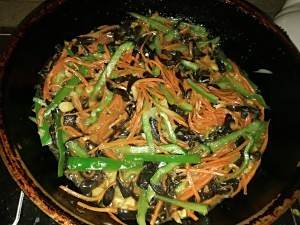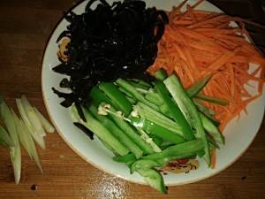 木耳提前半小时泡发,所有配菜洗净切丝,葱姜切片备用