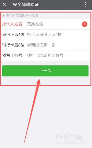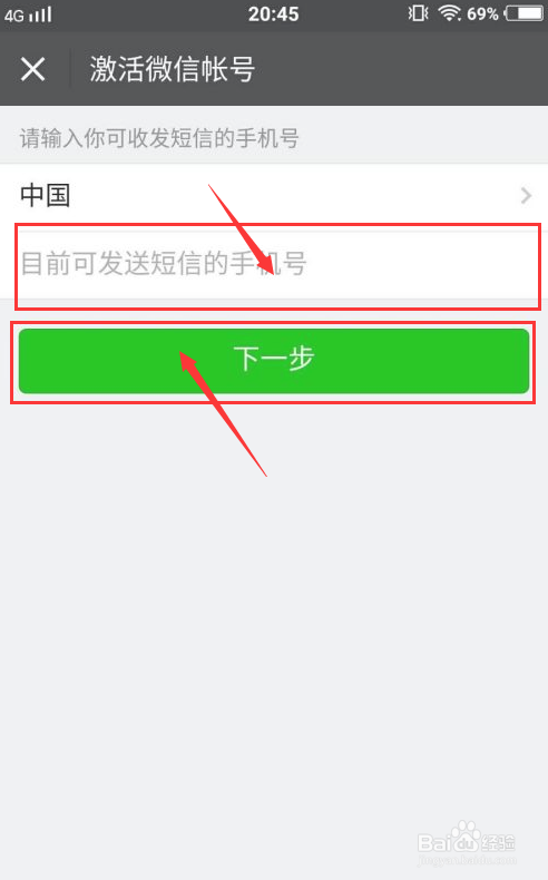 接下来,我们在弹出来的输入手机号码的界面,我们输入我们的手机号码(不是这个微信绑定的号码,好友的号码),并点击下一步;
