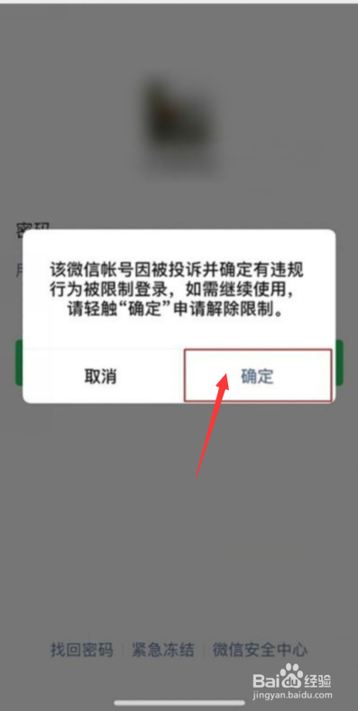 首先,我们在微信客户端的登录页面输入账号密码,登录后,出现被冻结的界面,这时,我们点击确定按钮;