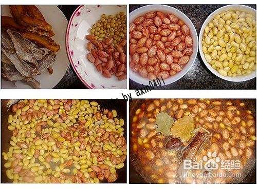 锅内倒油后放葱爆香后加入泡好的花生和黄豆快炒,