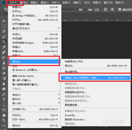 依次点击文件---导出---存储为web格式(旧版),如下图所示。