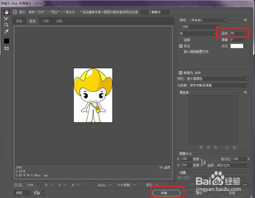 将图片的品质改为50,然后点击存储。我们发现图片的大小为9.41k,显然已经满足了要求。