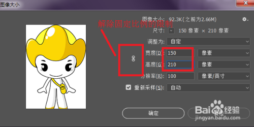 我们目的是将通过对图片适量的裁剪,然后将图片调整为宽度为150像素,高度为210像素的图片。通过尝试裁剪,我们将图片最终裁剪为了150像素*213像素,再微调的话裁剪时没有那么的灵敏。因此我们将宽和高前面的固定比例的按钮点一下,解除固定比例的限制。人为地将高调整为210像素。效果如图2所示。